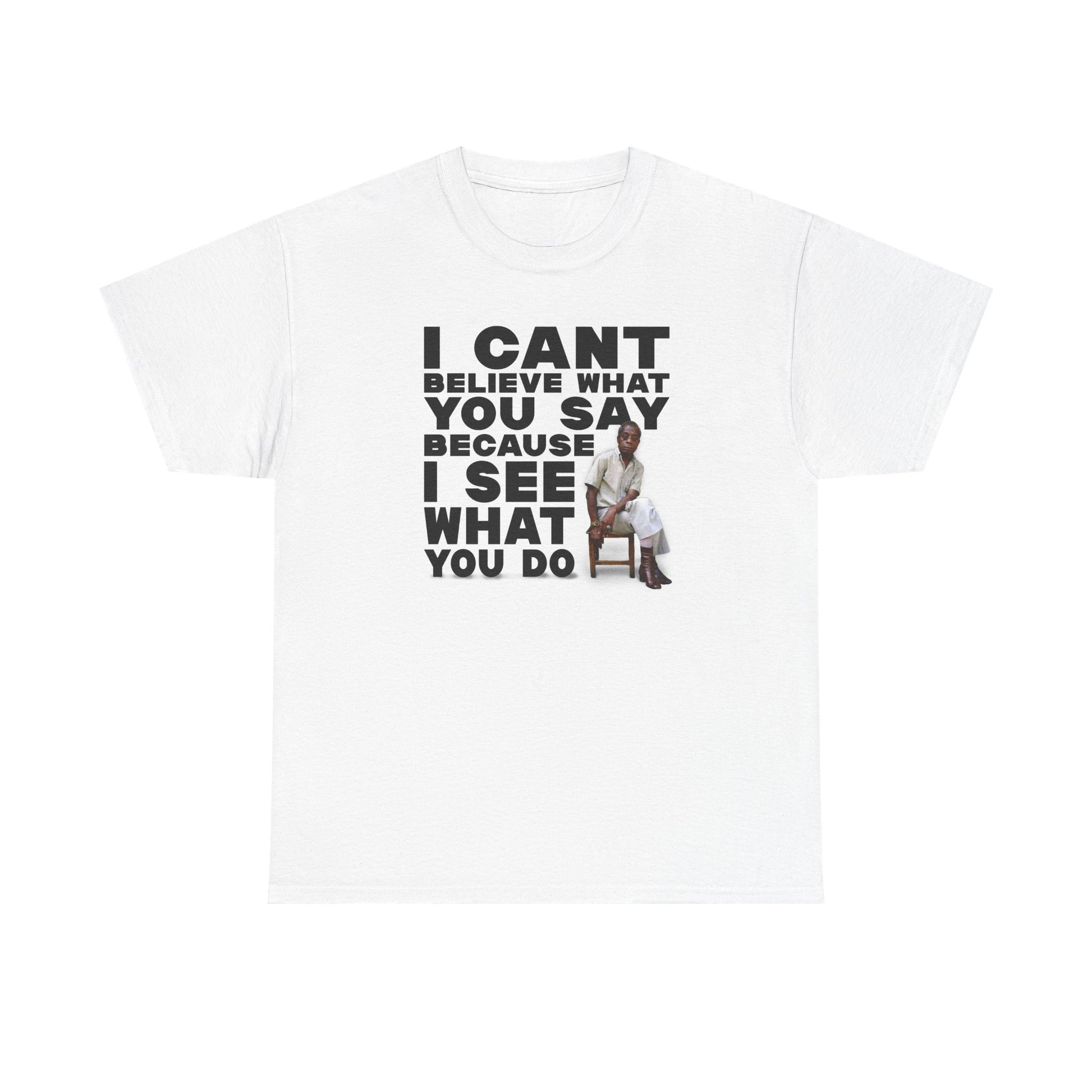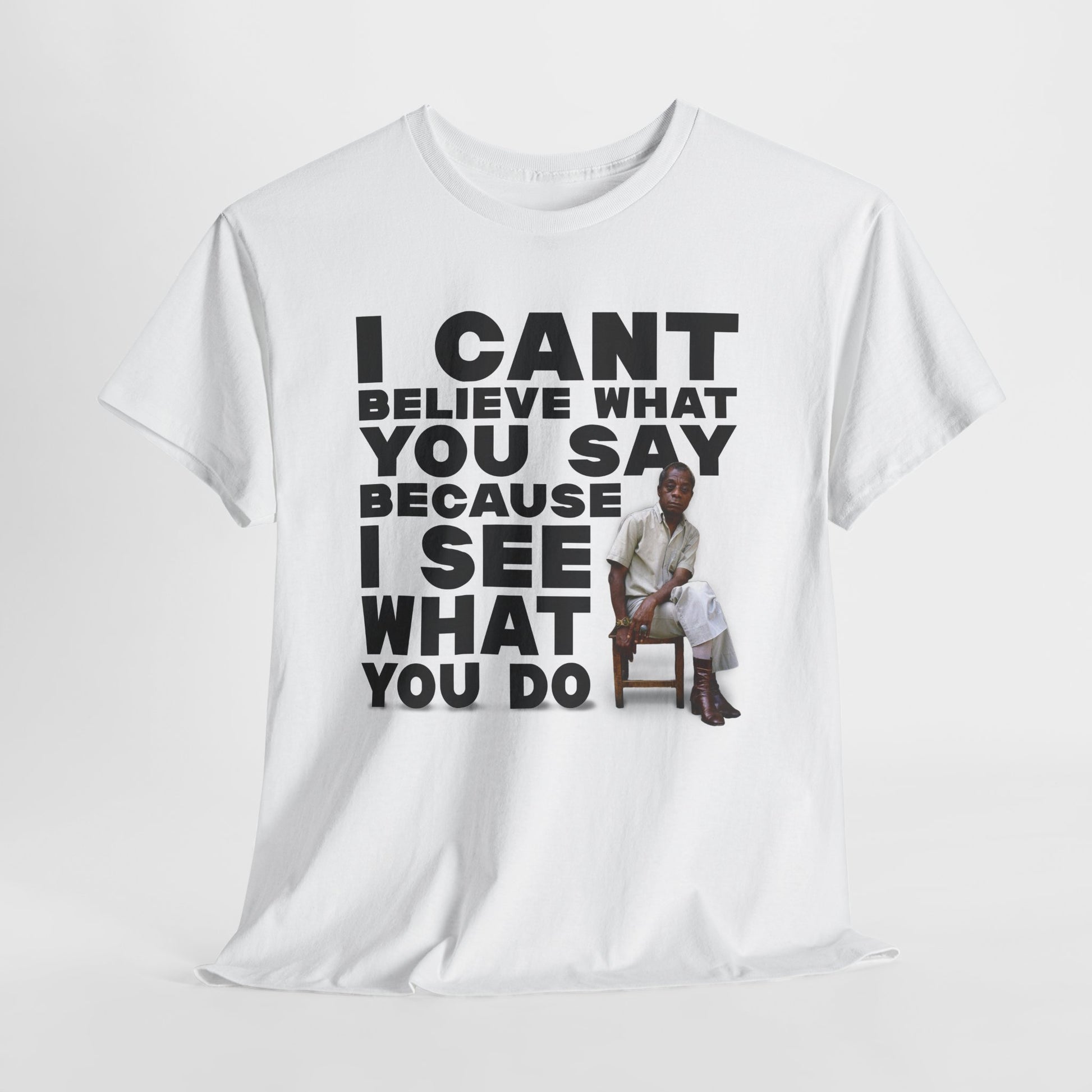 Featuring Baldwin’s powerful quote, “I can't believe what you say, because I see what you do,” alongside a striking typewritten design and regal portrait, this shirt is a bold statement of accountability, truth, and activism.